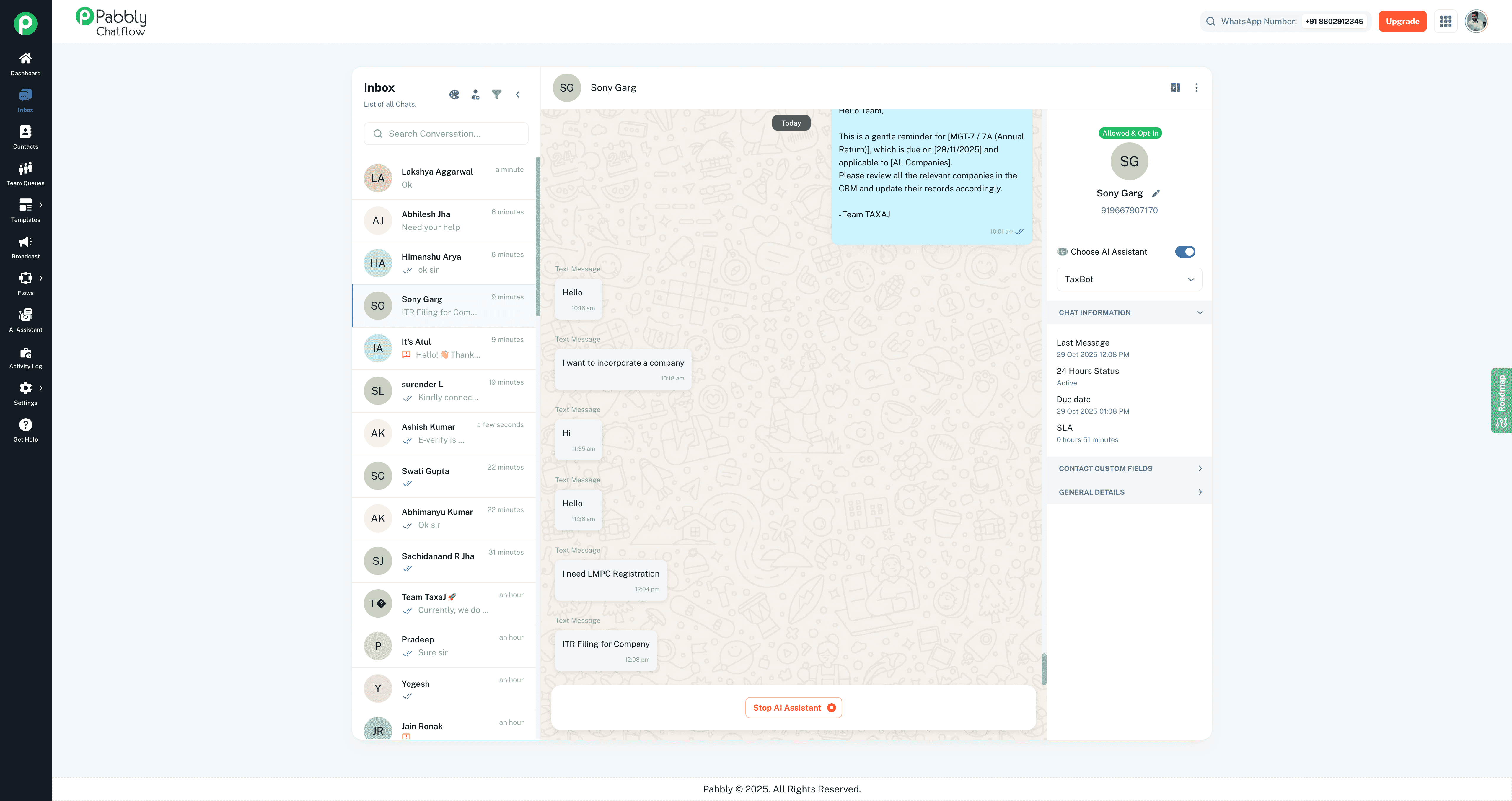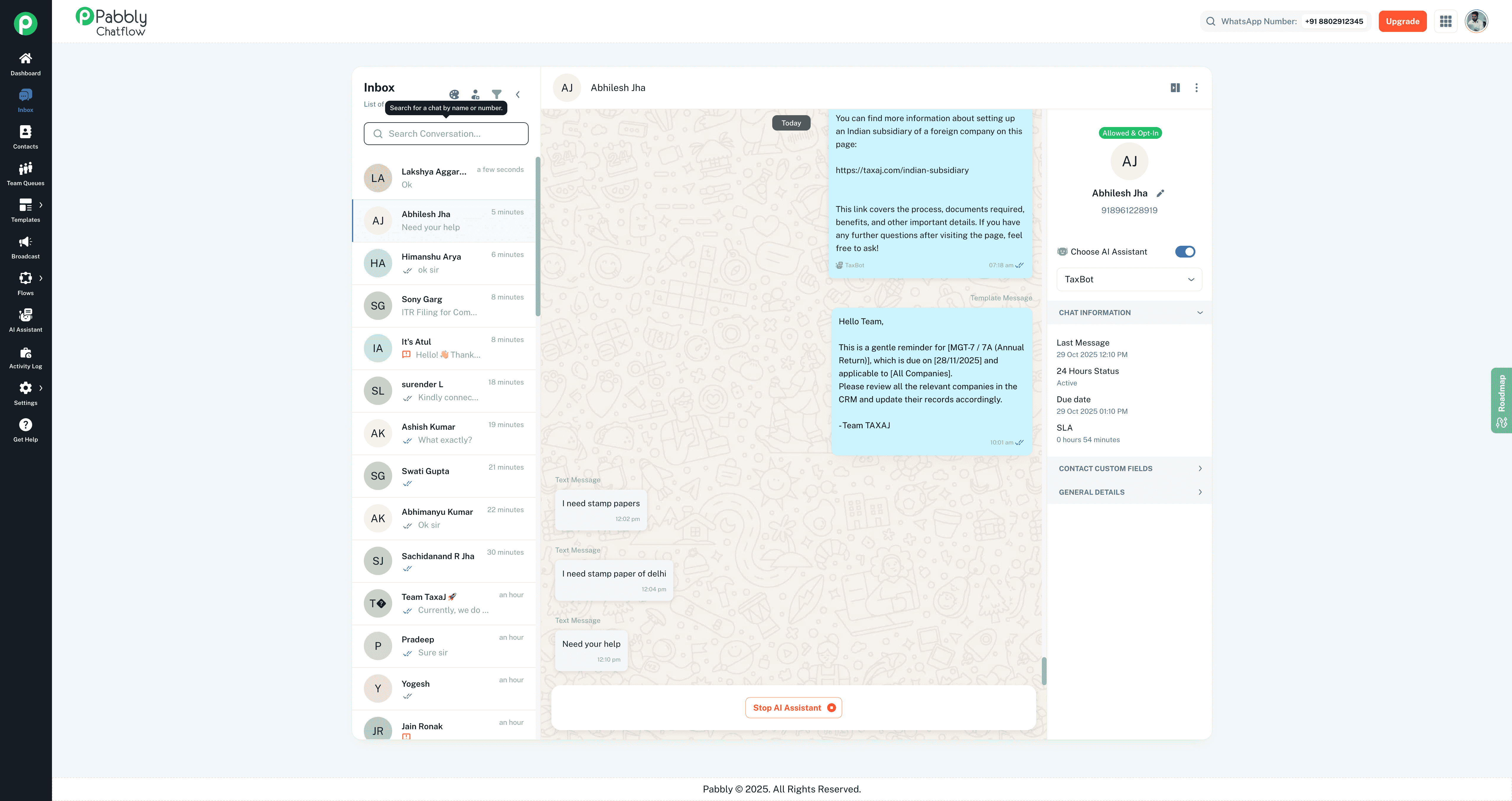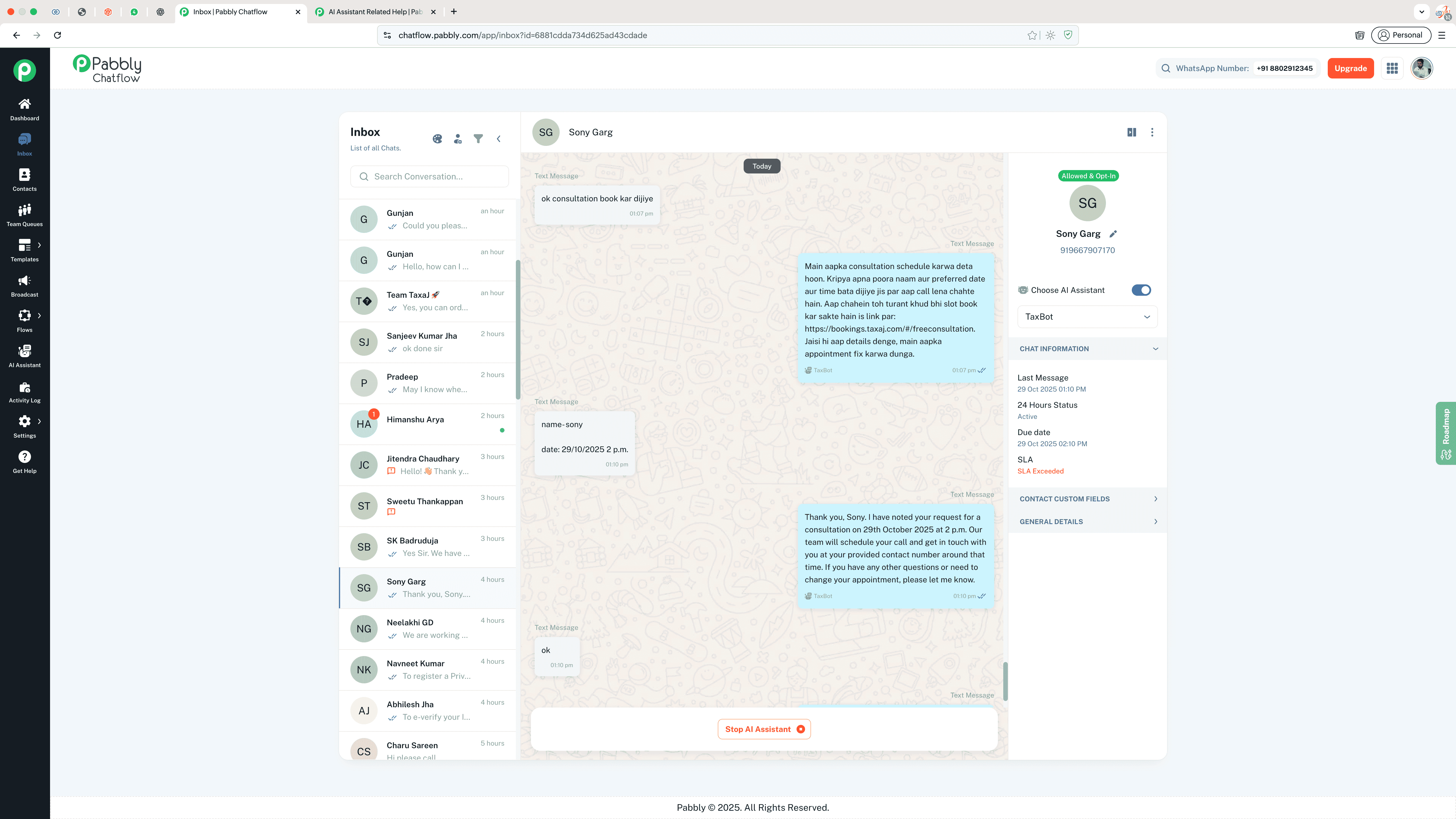 The AI Assistant only gets disabled when the chat status changes, which automatically stops the assistant from responding. Could you please share a few screenshots showing the chat status under the General Details section so we can review this further?