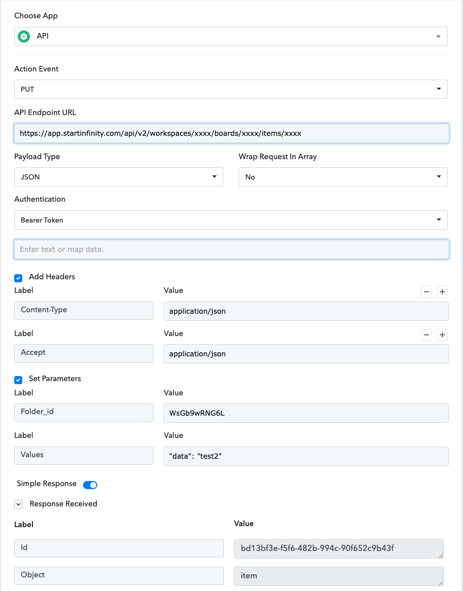 Instead of using the API by Pabbly action step to update an item, you can use the dedicated "Infinity : Update Item" action event.