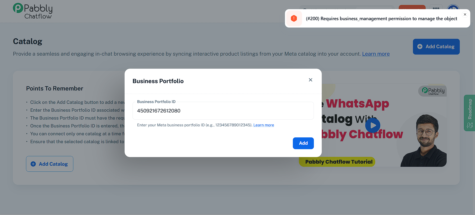 Created a catalogue. trying to connect it with chatflow with meta business portfolio ID. but error showing. please help.
