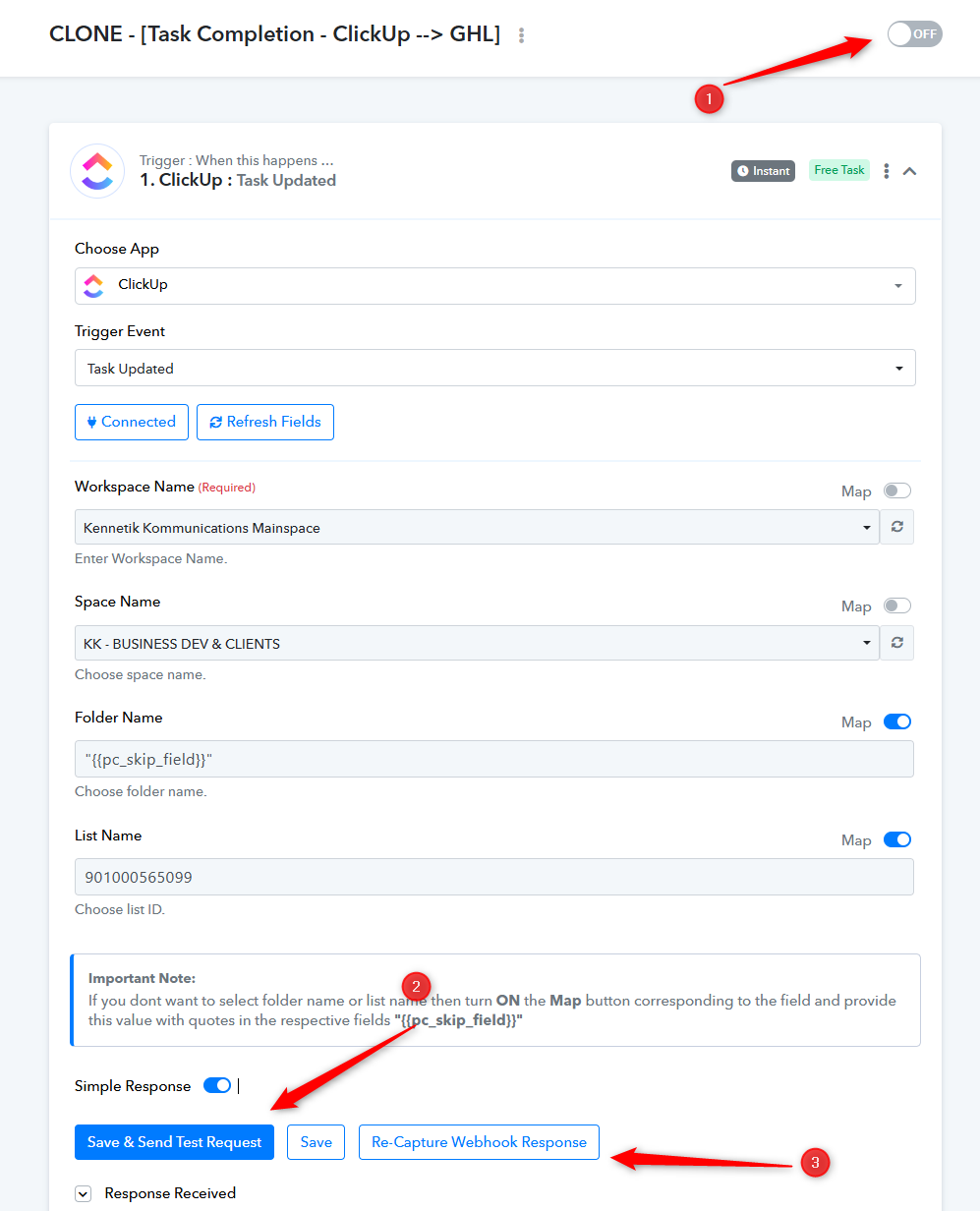 Pabbly Connect webhook to GHL & ClickUp connection only works once...